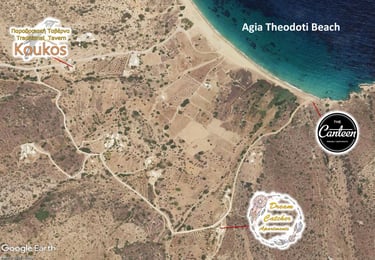 Enjoy the wonderful view and the friendly ambience of our restaurant, our Traditional Greek cuisine, our delicious and local homemade dishes. The local cheese and meat, fresh vegetables and fruit we use are our own products grown in our farm next to the restaurant, the fresh fish come right from the sea. Our restaurant is located at Agia Theodoti, 9 km from Ios Village (Hora), 3 minutes walk from the sandy beach.